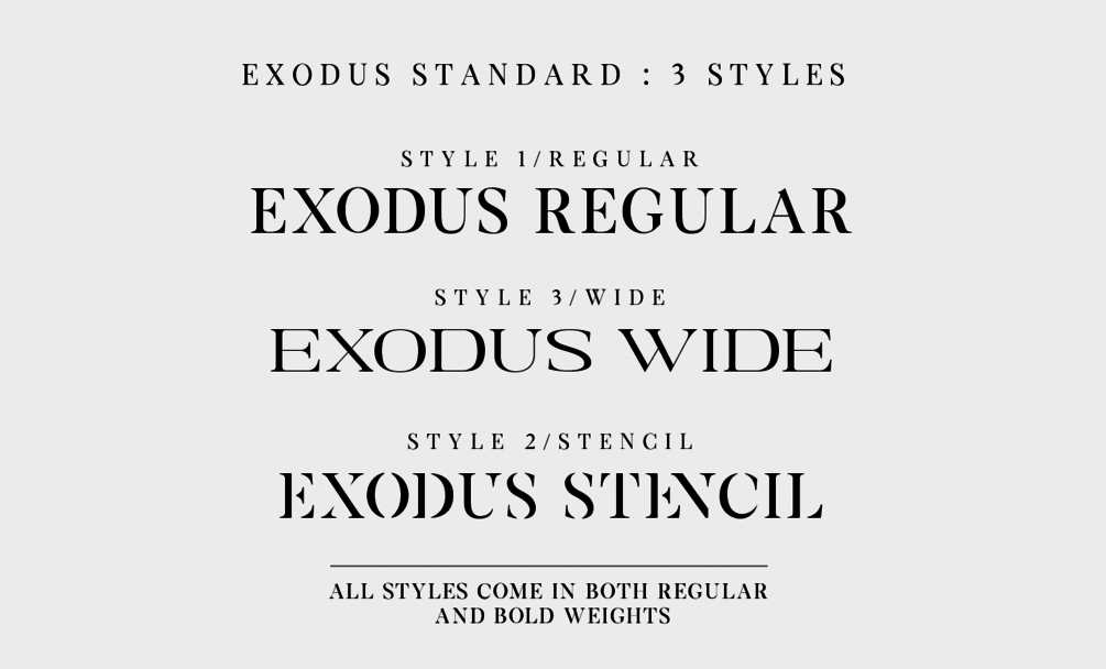 Exodus Standard comes with Exodus Regular, Bold, Stencil, Stencil Bold, Wide & Wide Bold.