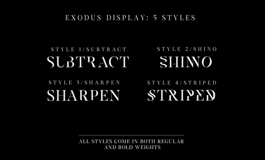 Exodus Display comes with Exodus Subract, Subtract Bold, Shino, Shino Bold, Sharpen, Sharpen Bold, Striped & Striped Bold.